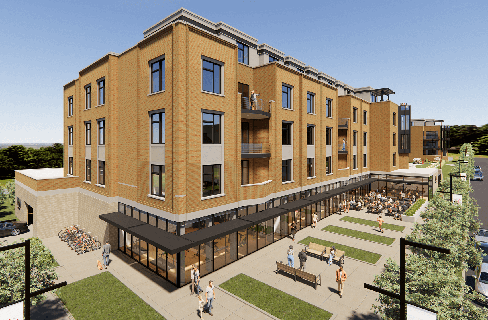 Although renderings for the building were not yet available, the design calls for a “strong street facade with ample glass” and recessed balconies on each unit, according to the proposal. The cascading stairs at KPAC will be echoed across the street in the new plaza design, Stephens said.