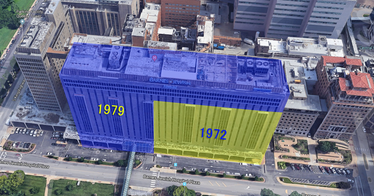 I just recently discovered that the Barnes-Jewish Pavilion building is actually two separate buildings built independently and opened several years apart - East first in 1972, then West in 1979.