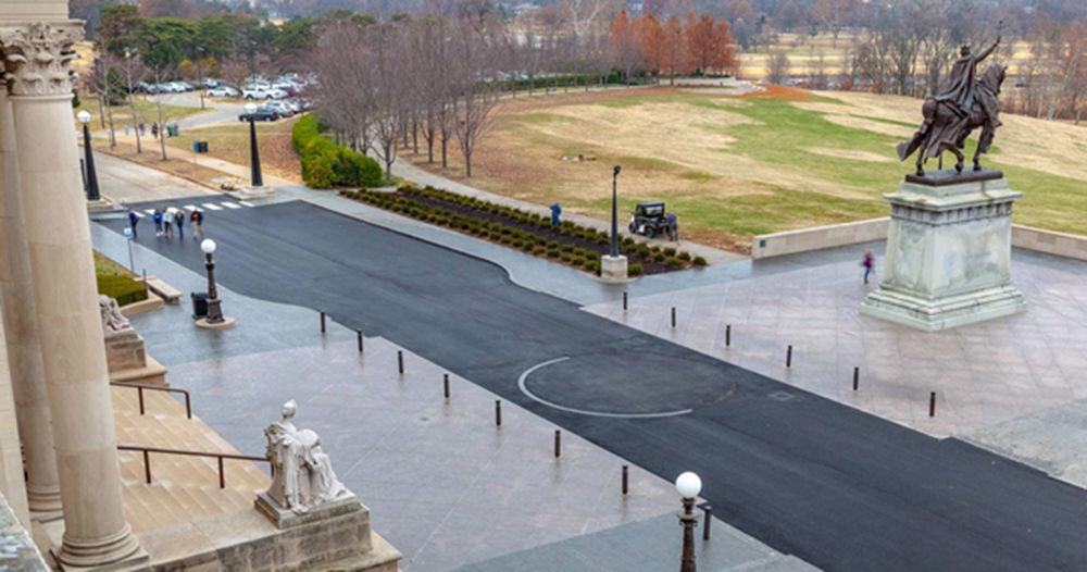 "An important work by American sculptor Richard Serra is being installed in the road between the Main Building steps and the Apotheosis of St. Louis statue. Serra meant for this work to be embedded in asphalt so that it can be driven and walked over, rather than simply observed.