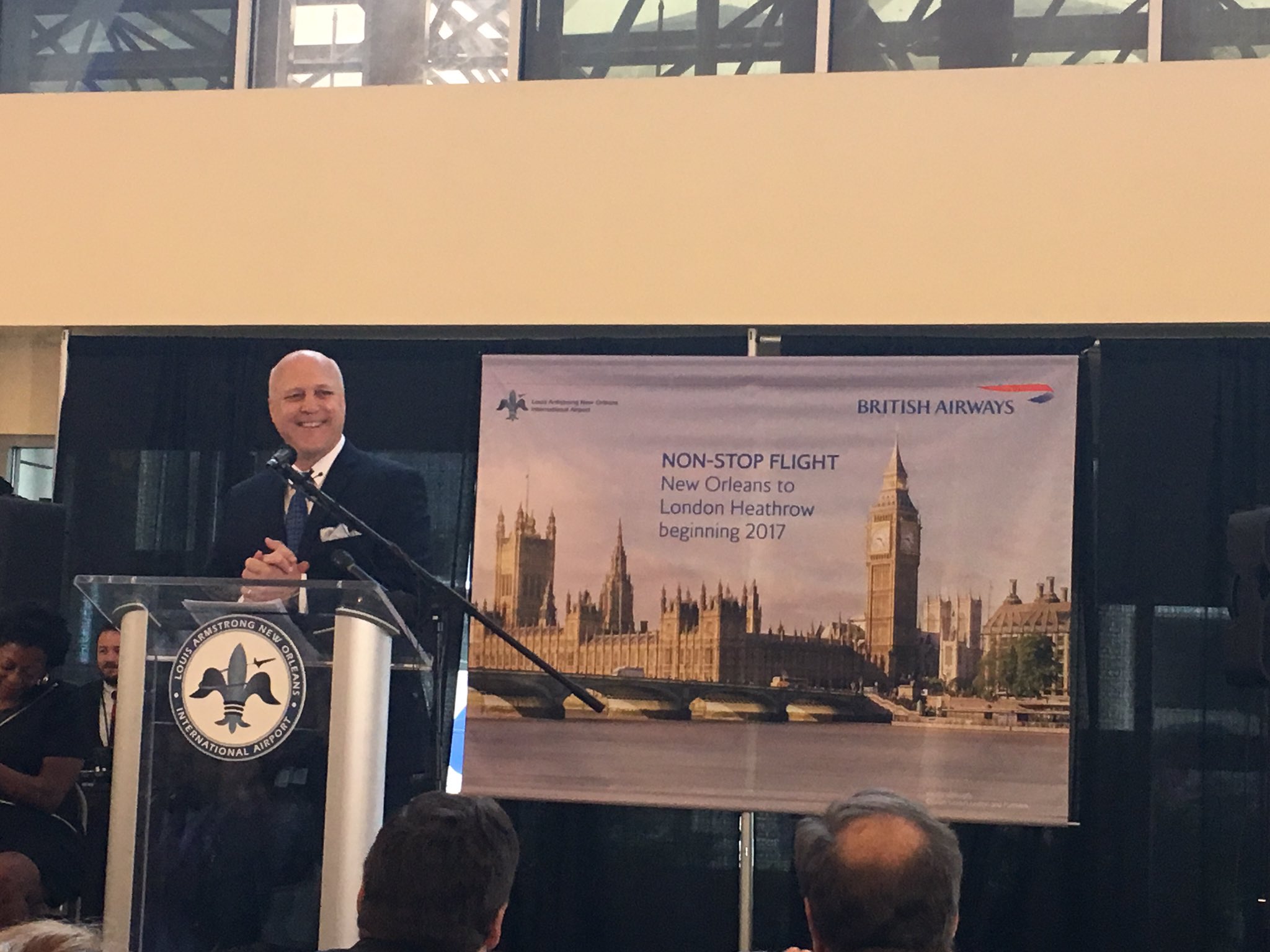 In January 2014, Armstrong's then-Aviation Director Iftikhar Ahmad, Hecht, Perry and businessman Greg Rusovich went to London to meet with British Airways. Rusovich's extensive local roles have included the chairmanship of the Convention and Visitors Bureau and GNO Inc.