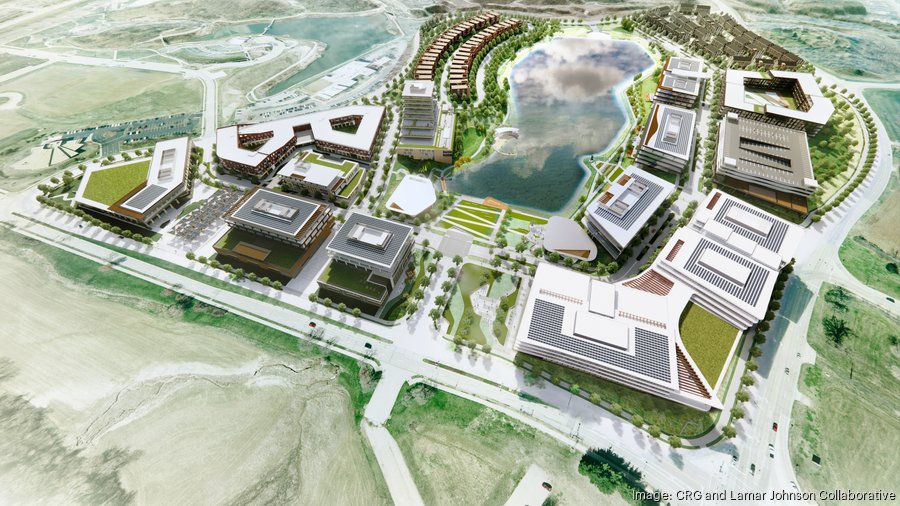 CRG is nearing completion of site work and has launched development at Wildhorse Village, an 80-acre mixed-use urban community that will offer residential, retail and commercial office space situated around a 15-acre lake. This rendering shows a view of the project from above.
