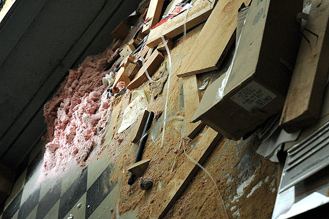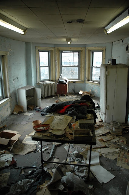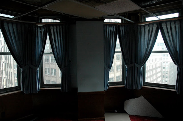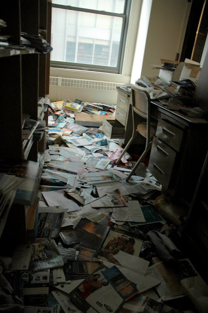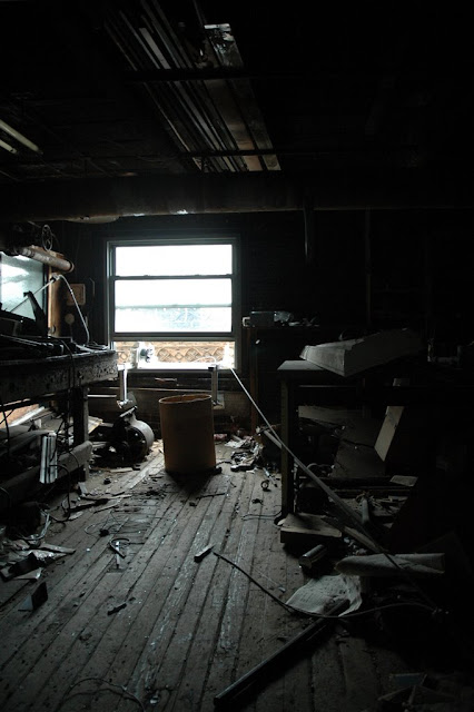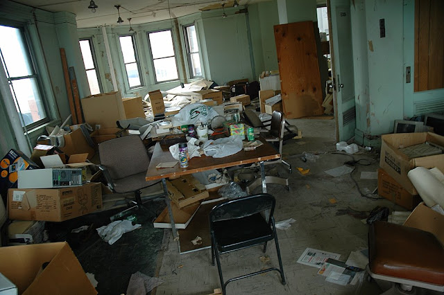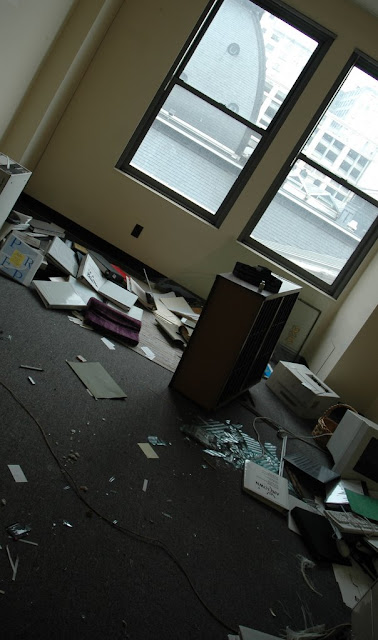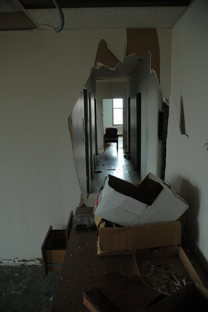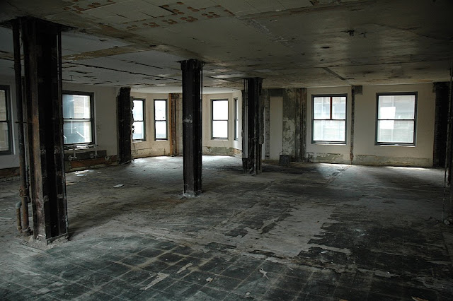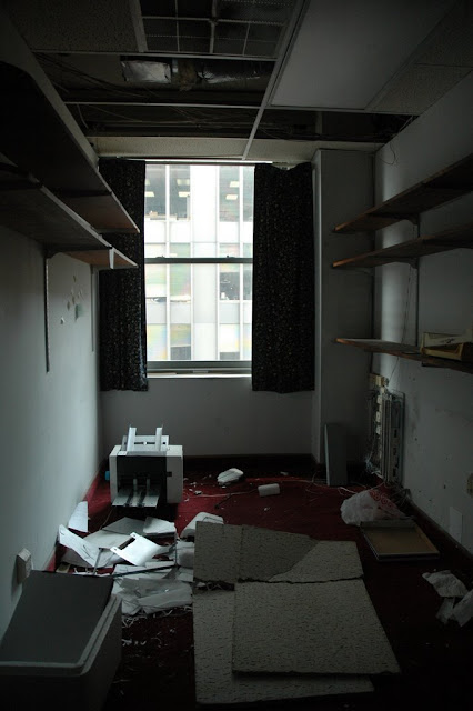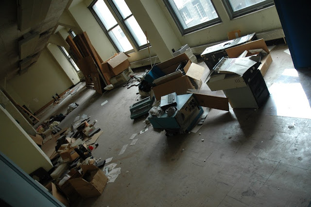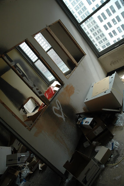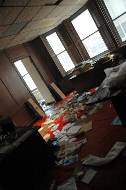 the place was in total chaos when I toured the building in April, before any real demo had taken place. the photos basically start at the top floor and work down. the building has basically been abandoned & ransacked. the whole building was unlocked.